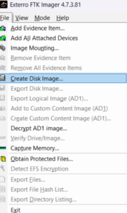 Now the malicious activity has taken place. We will pretend this activity would be flagged by a corporate EDR/SOC solution and isolated. We will now take a read only image of the computer before verifying the hash associated with the image before beginning investigation. We need to be able to verify that the image has not been edited as otherwise this evidence would not hold up in court. I will be using Exterro which is a common opensource image used by many anlysis companies and looks like this